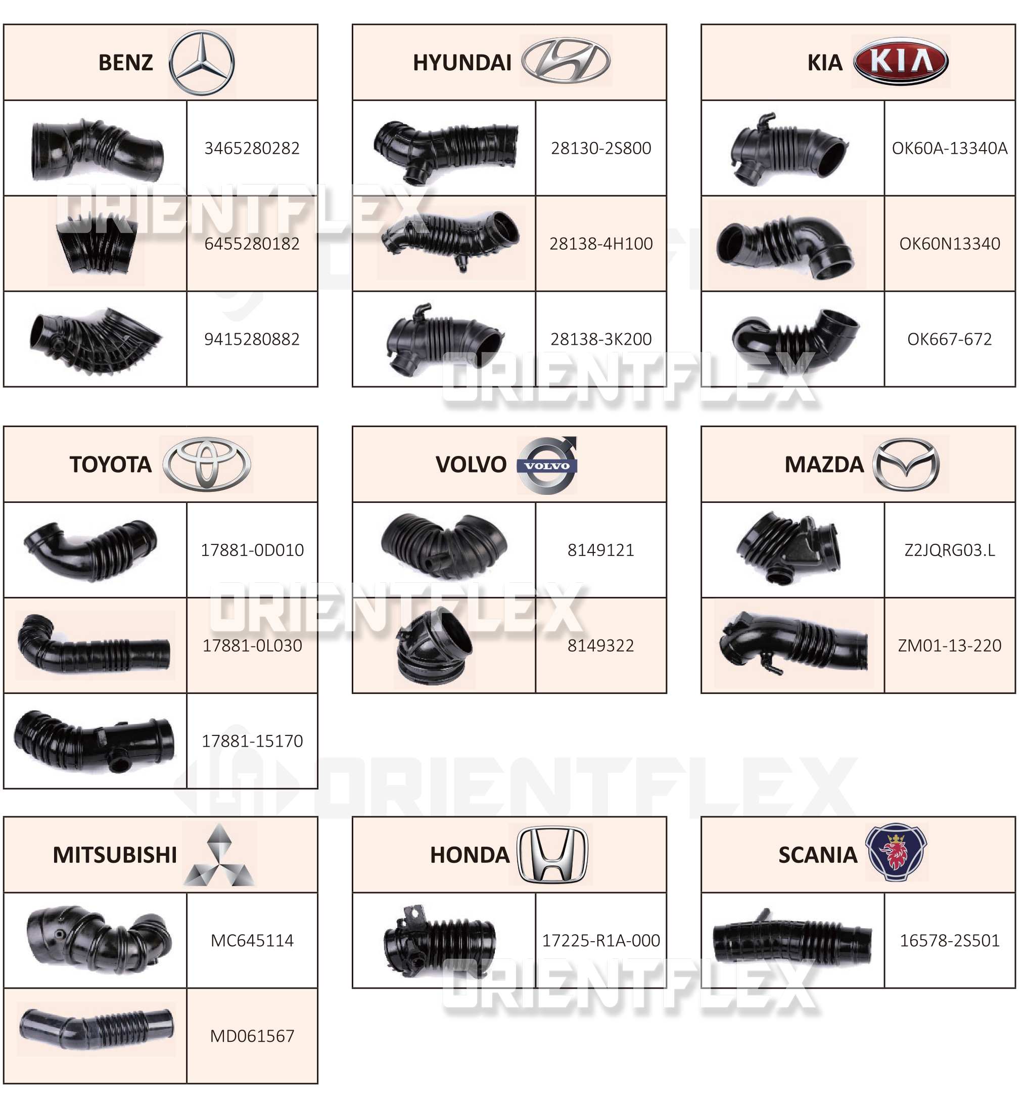 We offer a wide range of air intake hoses compatible with multiple vehicle brands and models, including BMW, Mercedes-Benz, Porsche, Opel, Volkswagen, Audi, Honda, and Mitsubishi. Whether for German, Japanese, American, British, or French car series, our hoses provide a precise fit and excellent sealing performance.
